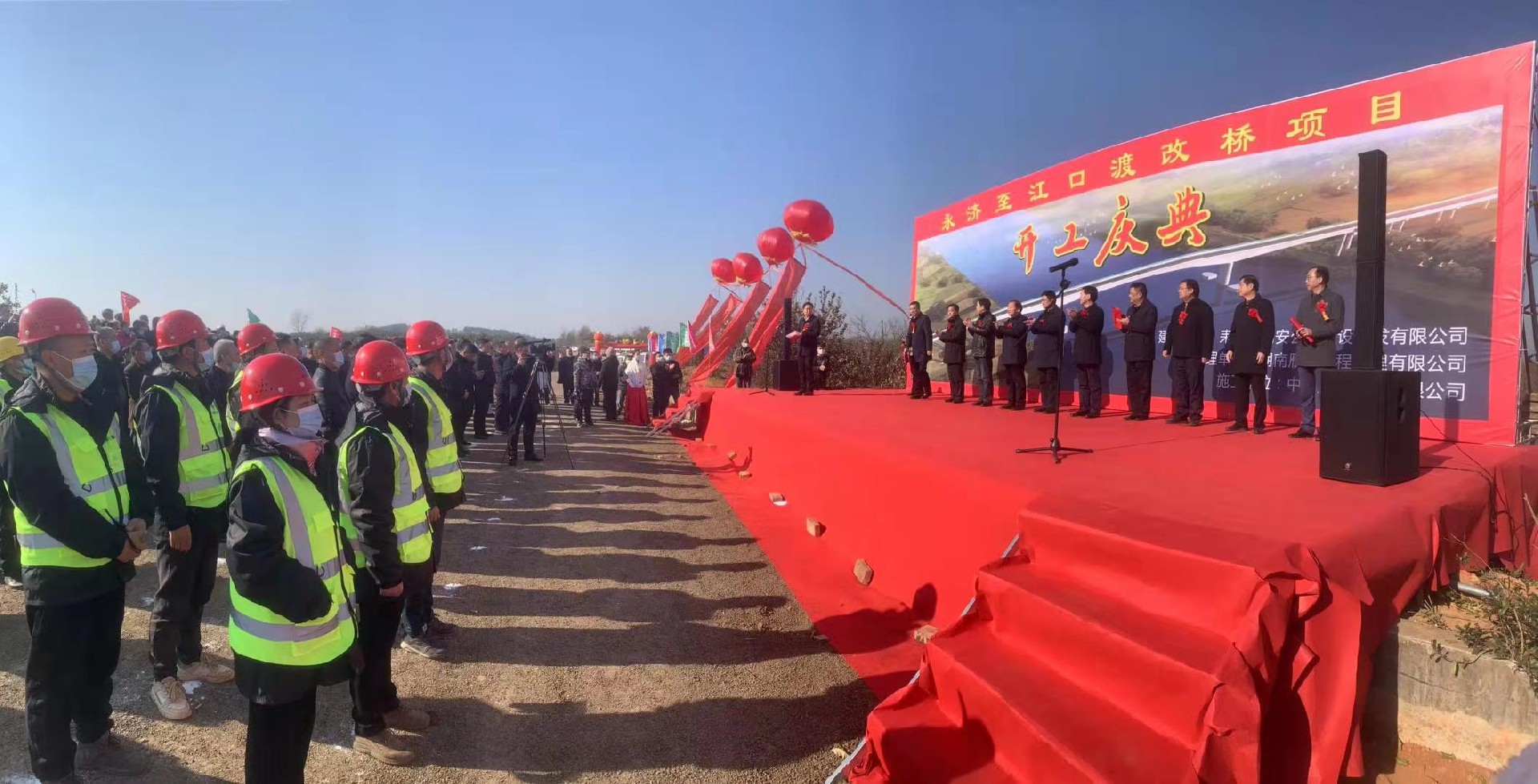 元月12日上午,由中南建设集团有限公司(下称中南建设)承建的永济至江口渡改桥项目开工庆典现场灯笼高挂、彩旗飘飘、鼓乐喧天、鞭炮齐鸣。一排排施工设备整装待发、一个个施工队员精神抖擞,西乐队与腰鼓队此起彼伏、争奇斗艳,当地十里八乡村民相继涌来、喜形于色,好一派繁华、热闹的喜庆景象。